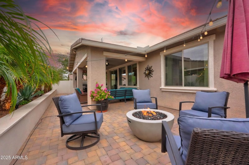 The chef's kitchen overlooks an open great room and features granite counters, under-cabinet lighting, herringbone pattern tile backsplash, R/O system, SS/appliances, 42'' cabinets with crown molding, microwave/convection oven, gas counter-level cooktop, and a walk-in pantry. Adjacent to the great room, a huge primary suite opens to a spa-like bathroom, complete with walk-in shower, double vanities with integrated make-up counter, and incredible walk-in closet carefully designed for the most seasoned buyer. The foyer at the main hall opens to three spacious guest rooms, two of which offer walk-in closets. and a bathroom on one side, with a large utility room, featuring an included washer & dryer. While the extended garage space offers ample storage for your belongings, you'll also find an included soft-water system, electric vehicle (EV) receptacle, and access door to the back yard. Since AZ life revolves around the outdoors, you'll love the expansive covered backyard patio, complete with TV, custom entertainment/storage bar, and extended artistic pavers to entertain all of your seasoned guests. Numerous additional upgrades such as can & under-cabinet lighting, a newer A/C unit, ceiling fans & more have been added to save you $$ & capture your heart!