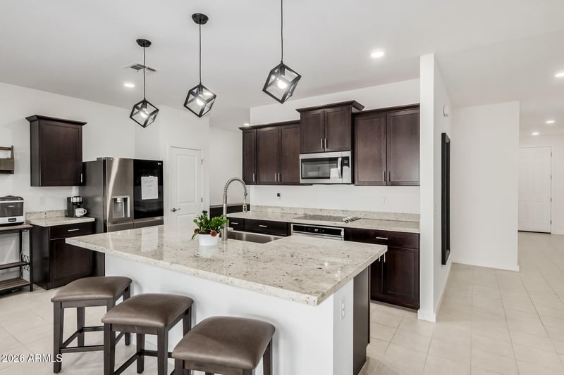 Listing details for 22466 Sonora St, Buckeye, AZ 85326 : LIKE NEW! Stunning 3-bed, 2-bath home in Coyote Ridge, perfectly situated on a premium corner lot. Enjoy low-maintenance landscaping, a 2-car garage, an RV gate, & a paver driveway. Step inside to a spacious great room w/ high ceilings, tile flooring, & a neutral color palette throughout. The gourmet kitchen is a chef's dream, featuring espresso cabinetry w/ crown molding, granite countertops, pendant lighting, & an island w/ a breakfast bar. The primary suite offers a private bath w/ dual sinks & a walk-in closet. The generously sized backyard, complete w/ a covered patio & artificial turf, ideal for summer cookouts or simply enjoying the mountain views. Conveniently located just minutes from I-10, Costco, and the upcoming amenities & shopping center off the Verrado exit!