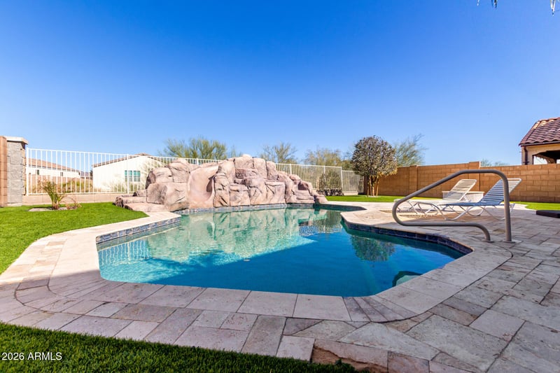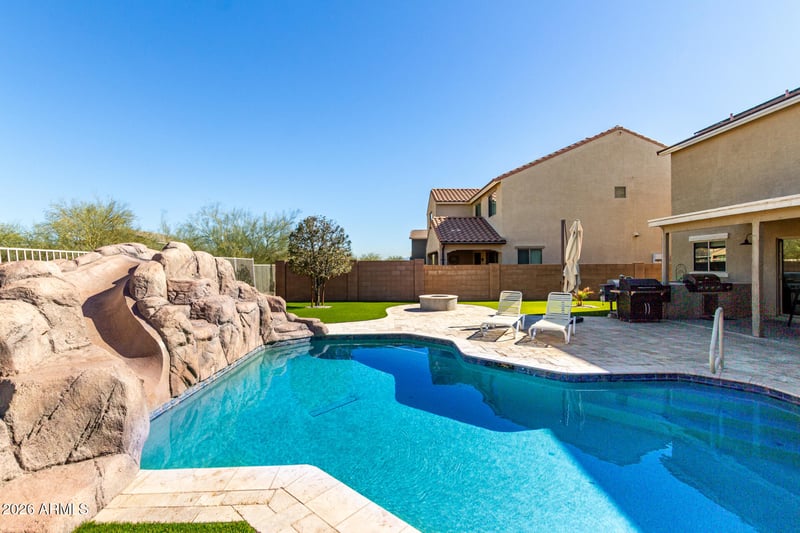 Listing details for 2247 Hughes Dr, Buckeye, AZ 85326 : Welcome to this beautifully maintained Buckeye home with upgrades inside and out! The backyard is a true desert oasis featuring a sparkling pool with a water slide, LED color-changing lights, and plenty of space to entertain. Enjoy the convenience of an RV gate with recently installed pavers extending from the driveway, perfect for storing your recreational toys. The backyard also includes a shed for extra storage. Inside, you'll find a spacious layout with a large loft upstairs—ideal for a home office, game room, or media space. The garage offers added functionality with overhead storage shelves and a brand-new motor and new garage door. Additional updates include a newer water heater and a whole-home water softener system. This move-in-ready home blends modern comfort with outdoor fun.