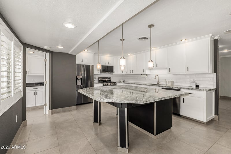 Listing details for 2249 Windrose Dr, Phoenix, AZ 85029 : Experience refined living in this stunning corner-lot residence with 2 RV gates, no HOA and RV pad with station! Custom designed courtyard with stone accents, beautifully designed interior with large tile flooring, crown molding, plantation shutters, and an elegant living room complete dry bar. The sleek chef's kitchen impresses with stainless steel appliances, granite counters, tile backsplash, white cabinetry, a spacious center island with a large breakfast bar that can seat the entire family. The relaxing primary suite offers a generous walk-in closet and a beautifully appointed bath. Double doors reveal a sizable den ideal for an office or 4th bedroom. Enjoy the added bonus of a huge dedicated workshop with its own half bath attached cabinets and AC. Room for 6 cars. The backyard is designed for entertaining, featuring a covered patio, built-in BBQ, and convenient rear vehicle entry. This exceptional property truly has it all. Come and experience it for yourself!