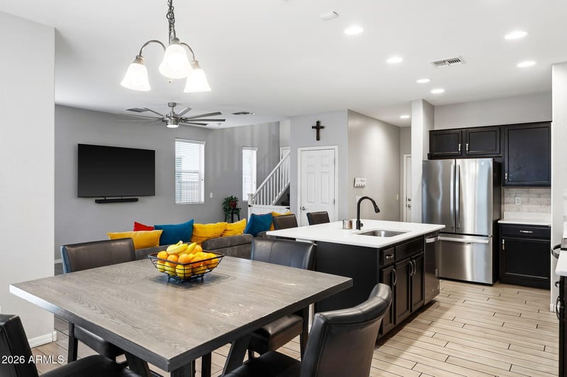 Listing details for 2254 University Dr #9, Mesa, AZ 85213 : Tucked inside a well-kept Mesa community, this end-unit townhouse sits on one of the largest lots in the neighborhood, offering rare space, privacy, and flexibility just minutes from everything you need. The expansive great room creates an effortless flow between the kitchen, dining, and living areas—ideal for both entertaining and everyday living. The kitchen is a true standout with an oversized island, stainless steel appliances, generous counter space, and breakfast bar seating that anchors the home. Neutral finishes, tile flooring, and carpeted bedrooms create a warm, move-in-ready feel, while the upstairs loft provides the perfect work-from-home space or relaxing retreat. The spacious primary suite features a walk-in closet and ensuite bath with dual sinks. Enjoy quick access to Loop 202 and US-60, nearby shopping, dining, fitness centers, and top Mesa conveniencesall while enjoying the comfort of an energy-efficient, low-maintenance home.