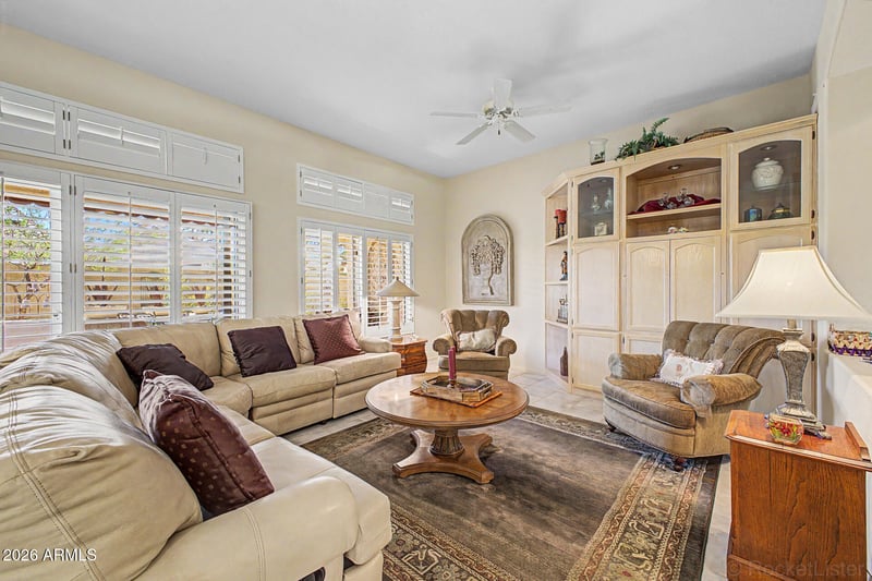 Listing details for 22610 Mirage Ln, Sun City West, AZ 85375 : Become the proud owner of this lovely 2-bedroom residence on a cul-de-sac in Beautiful Sun City West! Featuring desert landscaping, a 2-car garage plus golf cart space. Enjoy high ceilings in the living and dining areas, plantation shutters, and tile flooring throughout. The kitchen offers a breakfast nook, Corian counters, white cabinets with crown moulding, recessed lighting, stainless steel appliances, a pantry, and a peninsula with breakfast bar. The main bedroom includes a bay window, ensuite with dual sinks, step-in shower, and walk-in closet. A spacious bonus room with closet and patio access adds flexibility. Relax in the backyard with a covered patio and tranquil water feature. HVAC and roof 2020. Exterior paint 2024. Enjoy all the amenities of this vibrant retirement community!