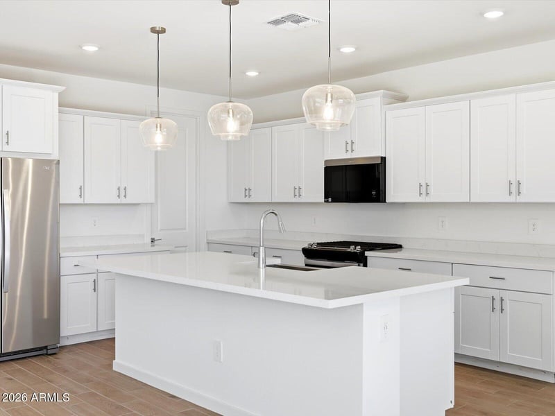 Listing details for 22636 Pontiac Dr, Surprise, AZ 85387 : A Spacious and Unique Single-Story Home! The Lark floorplan offers a single-story layout with 4 bedrooms, 3 bathrooms, PLUS a versatile flex space. As a bonus, Bedroom 4 includes its own private bath and walk-in closet. With plenty of space and smart design, the Lark is perfect for modern living and entertaining. This home has white cabinets with hardware, quartz kitchen counters, wood-look tile flooring and carpet in the bedrooms! INCLUDED - washer, dryer, window blinds, refrigerator and MORE! Relax in the serene and peaceful community or enjoy the White Tank Mountains and nearby hiking! Each home is built with innovative, energy-efficient features designed to help you ENJOY more SAVINGS!