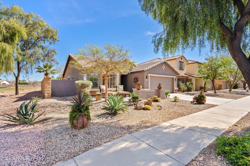 The split floor plan enhances privacy, featuring a spacious primary suite with dual sinks, soaking tub, and separate shower. Enjoy Arizona evenings on the covered patio with extended stamped concrete and golf course views. The garage offers painted floors and built-in cabinetry for added storage.