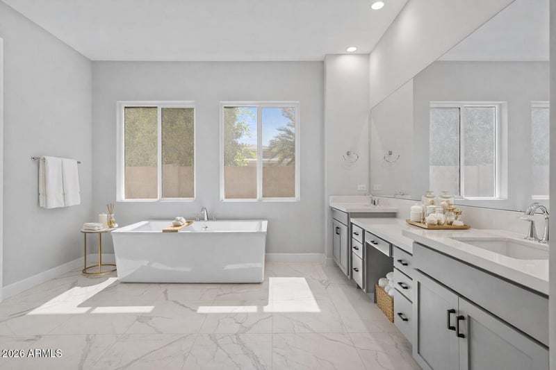 Inside, natural light pours through dramatic vertical windows, highlighting the home's thoughtfully designed split floor plan that offers both openness and privacy. This home features a rare dual primary suite design, making it ideal for multi-generational living, hosting guests or giving family members their own comfortable space. The second primary suite offers its own private bathroom and closet, creating a true retreat.