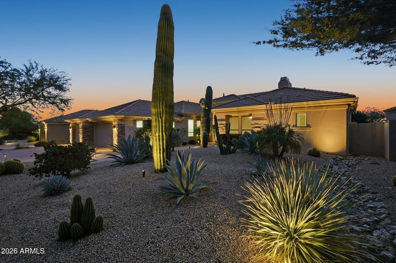 Listing details for 22806 55th St, Phoenix, AZ 85054 : Located in the prestigious gated community of Ironwood Greens, this stunning 4-bedroom residence features soaring 12-foot vaulted ceilings and an expansive wall of glass that perfectly frames a resort-style backyard and shimmering ultra-blue glass tile pool. The open-concept interior flows seamlessly from the formal living area and gas fireplace into a spacious family room, highlighted by a stylish coffee and wine bar. At the heart of the home, the chef's kitchen serves as a showstopper with its massive quartz island, 48'' Ca'Lefort wine refrigerator, Miele dishwasher and professional stainless-steel appliances set against a striking floor-to-ceiling subway tile backsplash. The primary suite offers a private sanctuary with serene views and a Zen-inspired bath, complete with a freestanding soaking tub for two, an oversized walk-in shower, and dual custom closets. The thoughtfully designed split floor plan ensures maximum privacy, featuring a dedicated guest suite on one wing and two additional bedrooms plus a versatile bonus room ideal for a gym or media lounge, on the other. Every corner of the home is enhanced by high-end finishes like travertine flooring and quartz countertops in the large, refinished laundry room. Beyond the aesthetics, this home is exceptionally turn-key, boasting a newer roof and American Standard HVAC system (2022), California Closets design throughout, newer carpet along with newer gutters and interior window treatments from the Shade Store. The three-car garage includes built-in cabinetry, providing ample storage for any hobbyist. This property offers a rare combination of luxury, functional modern space, and structural peace of mind in one of the most desirable gated enclaves in Desert Ridge.