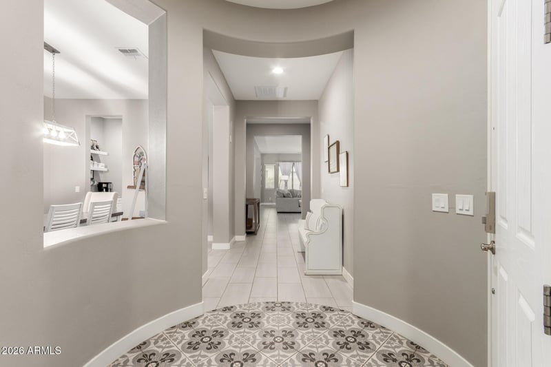 Listing details for 22903 Sonoqui Blvd, Queen Creek, AZ 85142 : Designed for both everyday living and effortless entertaining, this beautifully upgraded home welcomes you with a striking rotunda-style entry and designer tile flooring that flows seamlessly throughout the entire home — including all bedrooms.