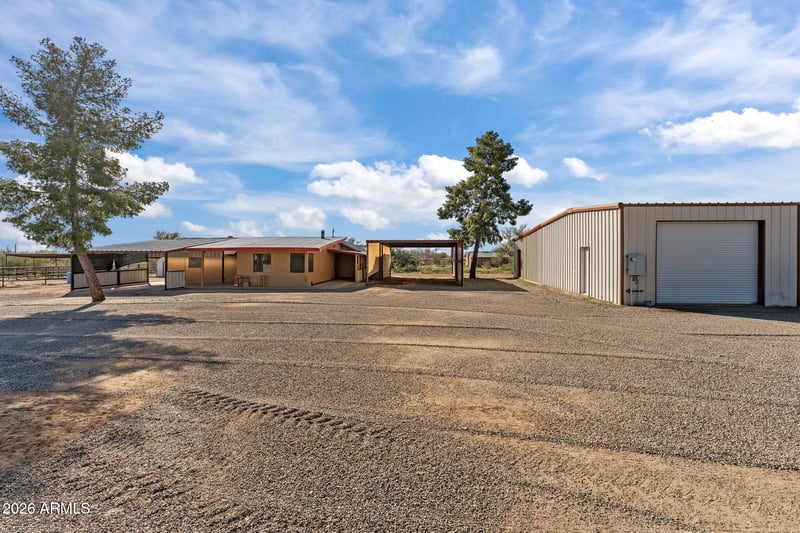 Listing details for 22905 Ranch Rd, Congress, AZ 85332 : Uncomplicated country living in Congress, AZ! This 2BD, 1BA home sits on a fully fenced 1+ac lot with room to spread out. Ideal for horse enthusiasts with several covered stalls, an RV gate, and plenty of space for trailers, toys, or equipment. A huge metal workshop, 22x50, easily doubles as a garage for large trucks, plus an additional covered metal bay for extra parking. Inside, enjoy a spacious kitchen with a granite tile island and abundant cabinetry. Located near Congress Park and endless trails for riding, hiking, and off-road adventures. This home is neat and tidy and will make a great seasonal residence or full-time HOME! Bring the horses and call it GOOD!