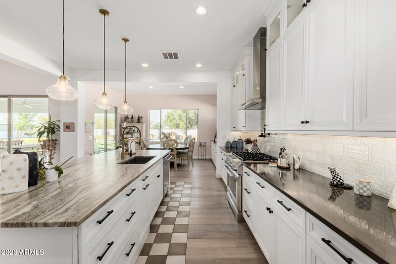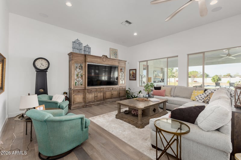 Listing details for 23000 Mccowan Ct, Queen Creek, AZ 85142 : Nestled on a quiet cul-de-sac and set on a full acre, this stunning 3,400 sq ft single-story home blends elegance, comfort, and exceptional design. The highly upgraded kitchen features premium appliances, fixtures, and designer finishes, including quartz countertops and a striking marble/dolomite island, complemented by a spacious butler's pantry with beverage refrigerator, coffee station, and abundant storage. The thoughtfully designed floor plan includes a private front ensuite bedroom, generously sized secondary bedrooms with walk-in closets, plus an open flex space and home office with beautiful built-in cabinetry. The expansive primary suite offers private patio access and a spa-inspired bath with high-end granite, separate vanities, soaking tub, and a custom closet with built-in shelving and hanging space. The home is equipped with a central vac system. Step outside to your resort-style backyard with a huge pool and spa with overspill, fire table conversation area, and a covered patio with built-in quartzite BBQ and outdoor TV are perfect for year-round entertaining. There is a sport court and plenty of room to build a RV garage (seller has approved plans and HOA has approved parking an RV on the North side of the street). See document tab for a complete list of upgrades.