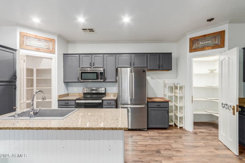 Listing details for 2305 Angel Way, San Tan Valley, AZ 85144 : Welcome to this beautifully maintained, move-in-ready single-level home offering 4 bedrooms with the flexibility of a potential 5th. Designed with a perfect blend of modern comfort and farmhouse charm, this home features upgraded vinyl flooring throughout for a warm, cohesive look and easy maintenance.The open-concept floor plan is ideal for both everyday living and entertaining, showcasing a bright kitchen with ample cabinetry, generous counter space, dual pantries, and seamless flow into the spacious living and dining areas. The primary suite provides a relaxing retreat with a private ensuite bath, abundant closet space, and additional storage. Secondary bedrooms offer versatility for guests, a home office, or hobby room. Step outside to enjoy plenty of space for parking & toys.