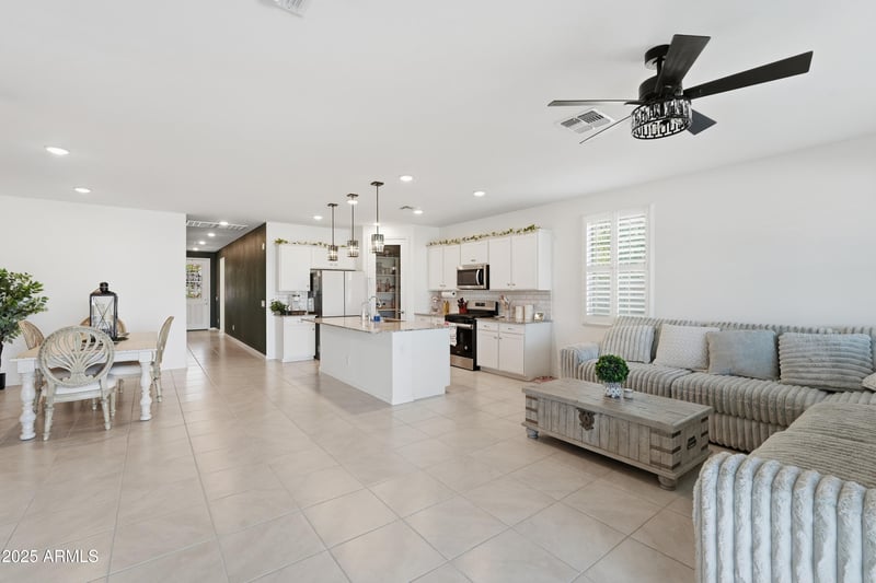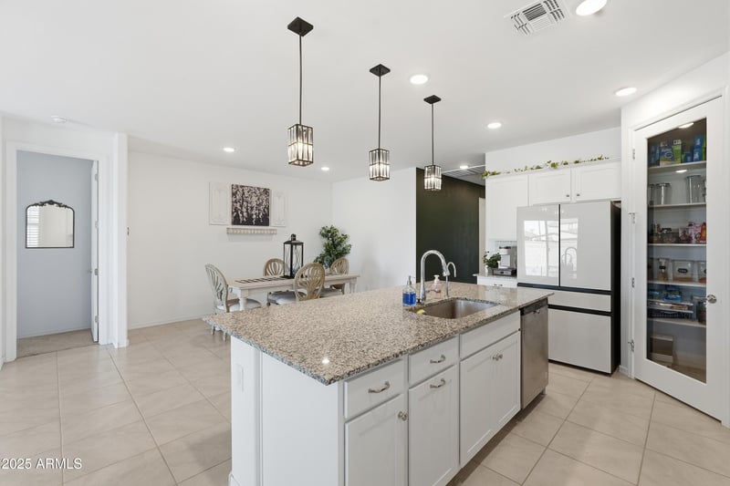 Listing details for 23052 Firestone Dr, Queen Creek, AZ 85142 : Built in 2024, this well-maintained Copper floor plan by Mattamy Homes is located in the desirable Empire Pointe community of Queen Creek. This single-story home offers 3 bedrooms and 2 bathrooms with a bright, open layout ideal for everyday living. Tile flooring flows through the main areas, with plush carpet in the bedrooms. The open kitchen features granite countertops, white cabinetry, and a large island, seamlessly connecting to the dining and living spaces. A cozy living room and den offer wonderful spaces to enjoy. A newly covered brick paver patio, turf and lively plants and garden area make for a true oasis. Community amenities include a gym, pool, playgrounds, and basketball courts.