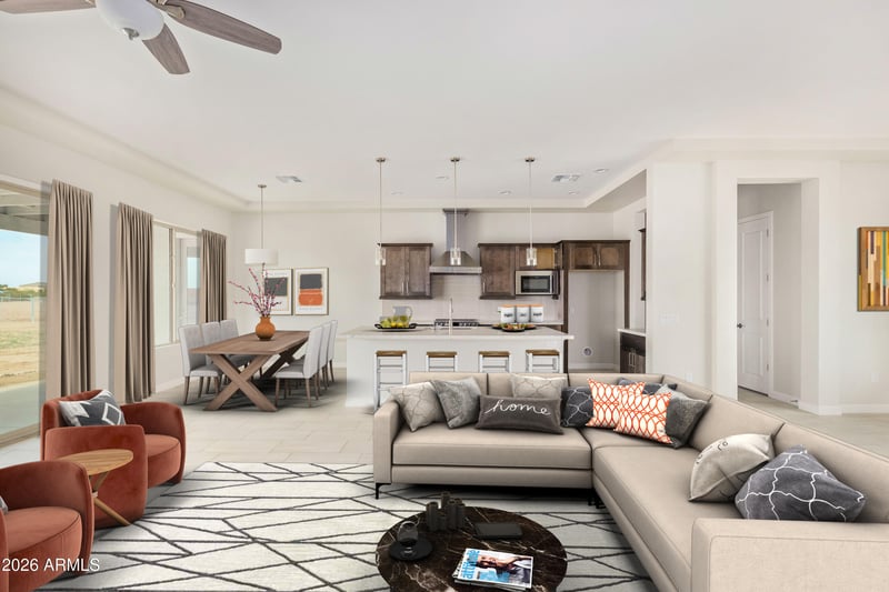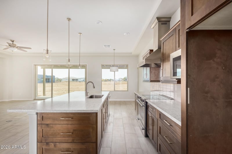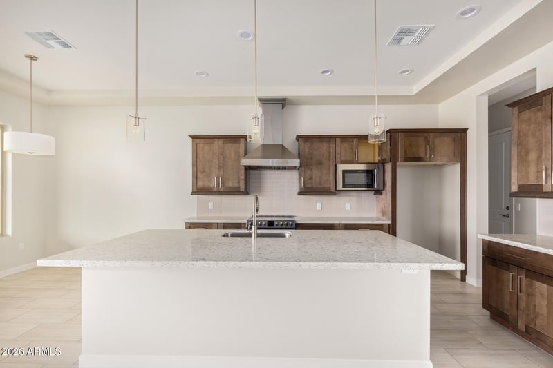 Listing details for 23153 Skinner Rd, Wittmann, AZ 85361 : This beautiful home is situated on an acre and on a quiet road with NO HOA! Block Fencing, Quartz counter tops, large center island, tile backsplash, built-in microwave, stainless steel hood, upgraded lighting, designer tile, his and hers walk-in closets in primary bedroom. 8' doors 10' ceilings, split floor plan 4 bedroom 2 bath 3 car garage! Located in a very nice area for riding UTV's and horses and only minutes from Surprise and Wickenburg.