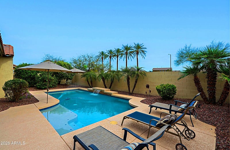 Listing details for 2323 163rd Dr, Goodyear, AZ 85395 : Beautiful Freshly Painted Vita With 2 Bedrooms, Den & A Pool! -- This Single-Owner Gem Is Nestled into the Tuscany Falls Side of PebbleCreek. Welcoming Entry Opens to a Fully Tiled Great Room With 12-Foot Ceilings and Seamless Flow into Kitchen and Dining Areas. An Expansive Patio with Shimmering Pool is Framed by Dramatic Wall-Length Sliding Glass Doors That Flood Space with Abundance of Natural Light. Additional Sliders in Dining Room Create Effortless Indoor-Outdoor FlowPerfect for Entertaining Family and Friends or Enjoying Your Private Oasis.