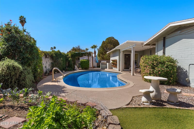 Listing details for 2325 Elmwood St, Mesa, AZ 85213 : Step inside to a warm, inviting home with SOLAR & Low maintenance POOL! An easy-flow layout perfect for daily life and entertaining. The spacious 3-bed, 2-bath floor plan offers flexible space for a home office, guest room, or growing family. The kitchen and main living areas connect seamlessly, so you can cook, dine, and relax together. Large windows fill the home with natural light. Outside, the generous lot offers room for a garden, play area, or custom outdoor living. So many updates, roof and A/C 2015, restore master shower 2025, remodeled guest bath with shower and jacuzzi tub, owned solar 2021, You're close to top schools, shopping, dining, and quick access to the 202 Red Mountain, in a solid, established Mesa neighborhood.