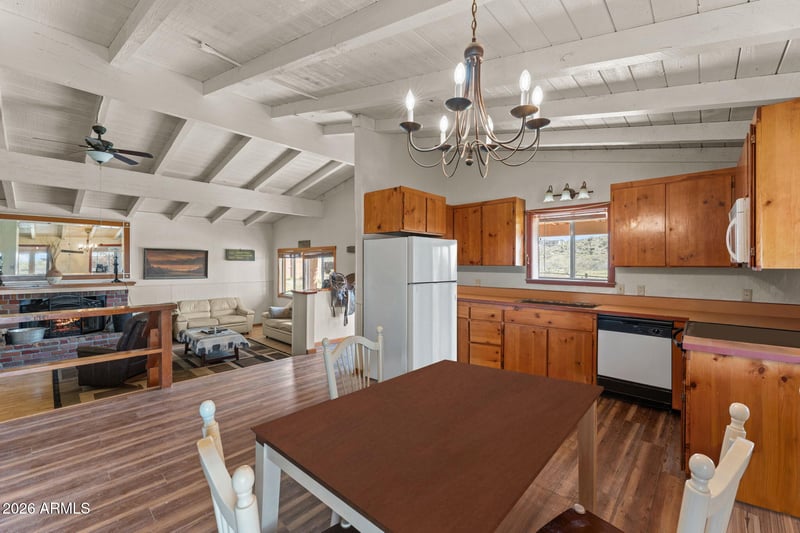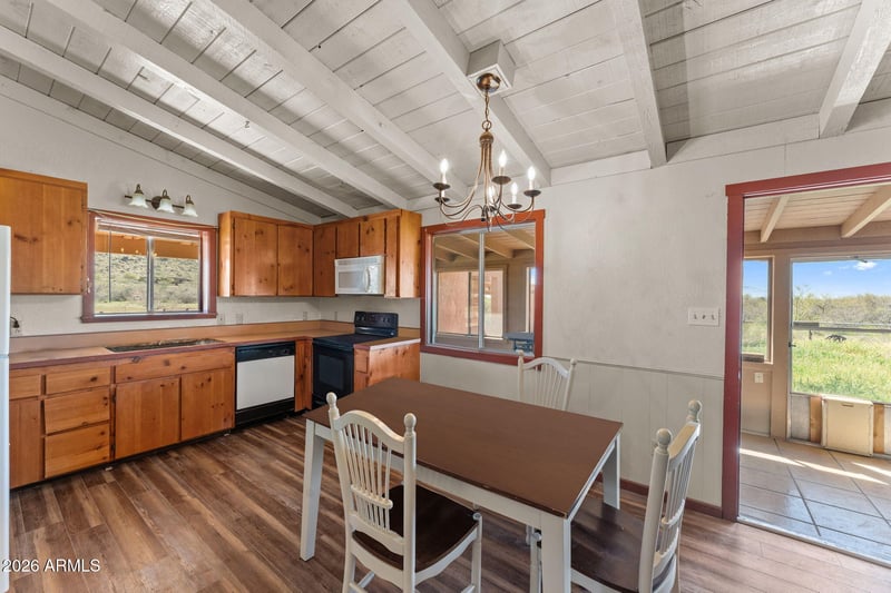 covered stalls & corrals. Date Creek Mtn views. Open floor plan of 1,536 Sq ft. w/ Gorgeous 11' 3'' wood ceiling throughout home. New Laminate flooring in kitchen. Pantry, & new GE Fridge. Wood Fireplace in LR. A 380 sq ft., AZ Room w/ceramic tile flooring w/11 windows w/screens + door. New (4) Split A/C's/Heating installed, Two RV Hookups. Plus a detached insulated Workshop/Garage; every man's dream a1,040 Sq FT w/ 6 skylights, water, 2 rollup doors on each end, 240 & 110 Wa electric. ALso has a detached 144 Sq Ft Storage Shed along w/ a 360 Sq Ft covered Carport.. Roof is a newer Metal w/foam. Great Opportunity