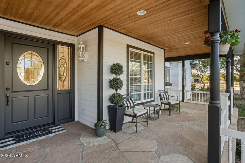 Listing details for 23416 182nd St, Gilbert, AZ 85298 : Rare find in Gilbert, Arizona! This stunning nearly 5-acre county island property offers the ultimate in freedom with NO HOA and horse privileges—perfect for equestrian living, multiple vehicles, toys, RVs, and more. Nestled on a spacious lot with irrigated pastures that stay lush and green, this beautiful farmhouse-style home exudes timeless farmhouse charm reminiscent of the iconic house in The Notebook—warm, inviting, and full of character with its mature pine trees, lit white vinyl fencing, grand driveway, flagstone porch, and custom clear heart-shaped stained-glass windows. The main house features 10-foot ceilings, three separate AC units, real Brazilian Pecan hardwood flooring (sanded and re-sealed in 02/2022) intricate hand-cut crown molding, and built-in wall units/desks throughout. Enjoy formal dining and living areas ideal for entertaining, plus a central vacuum system. The roof was replaced in February 2022, and recent updates include new interior and exterior paint, a remodeled master bathroom, new kitchen backsplash, fully remodeled guest house, and fresh new turf in the backyard for low-maintenance beauty. The open kitchen shines with abundant white cabinets, a large island, expansive Corian countertops, and a deep walk-in pantry, perfect for cooking enthusiasts. An oversized laundry room offers tons of cabinets and counter space. The family room boasts a remote propane gas fireplace and built-in media wall unit. A convenient powder room is located just inside the 3-car garage.The oversized main-floor master suite includes a sitting room, bay window with window seat, built-in entertainment wall, and desk. The luxurious spa-like master bath (fully remodeled) features a walk-in tiled shower, dual vessel sinks, private water closet, and a spacious walk-in closet with built-in island drawers. All secondary bedrooms are generously sized with huge walk-in closets; two large upstairs bedrooms share a bathroom and include a massive storage room with built-in shelves.Step out through the wall of Arcadia doors to a covered back patio overlooking a private green yard, pool with water feature under a raised gazebo, and unobstructed mountain views, ideal for relaxing in Arizona's summer heat. Nearby 220V power is ready for an above-ground spa. The fully renovated guest house/casita in the paddock area is wired and plumbed for a full kitchen, stackable washer/dryer hookups, and a full bathroom with walk-in shower. It has its own alarm system and is perfect for guests, in-laws, or multigenerational living. Security is top-notch with a powered front security gate and intercom, plus wiring for cameras monitoring the main house, guest house, garage, and shop. Attached to the casita is a well-lit 4-car garage with powered openers. The shop includes an 11.5k lb 2-post lift, 220V power, AC, and heating. Combined, the garages and shop accommodate up to 10 cars. Equestrian amenities await: 2 horse stalls with auto waterers, a middle hay stall, turnout pen, and horse wash rackready for your horses! This rare Gilbert horse property on acreage combines modern upgrades, farmhouse charm, privacy, and endless potential in a desirable county island location. Don't miss this exceptional opportunity!