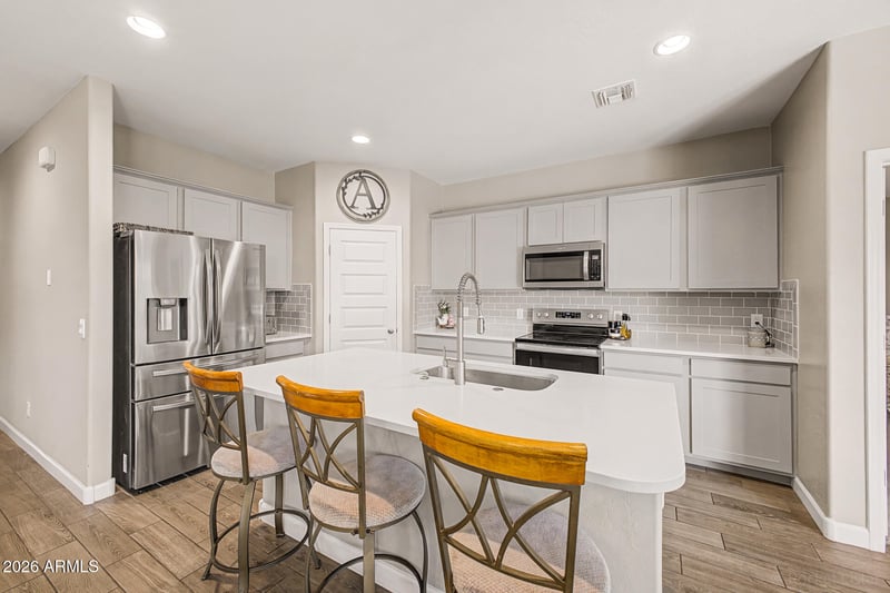 Listing details for 2371 239th Dr, Buckeye, AZ 85326 : Move-in ready 4 bedroom 2 bath home built in 2023 in Desert Moon Estates in Buckeye, AZ. Assumable VA Loan at 5.5%! Popular DR Horton Huntsville floor plan, 1,776 sq ft with an open layout designed for comfortable everyday living. The kitchen features gray shaker cabinets, stainless steel appliances, subway tile backsplash, and wood-look plank tile flooring in main living areas. Window coverings and ceiling fans are already installed throughout, making this home truly move-in ready. Situated on a 6,250 sq ft lot in a neighborhood with pocket parks, basketball court, and sand volleyball. Conveniently located near Sundance Park with fishing lake, splash pad, sports fields and playgrounds. Close to schools, shopping, dining and quick access to I-10 with an easy commute to Luke Air Force Bas