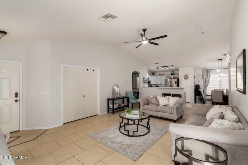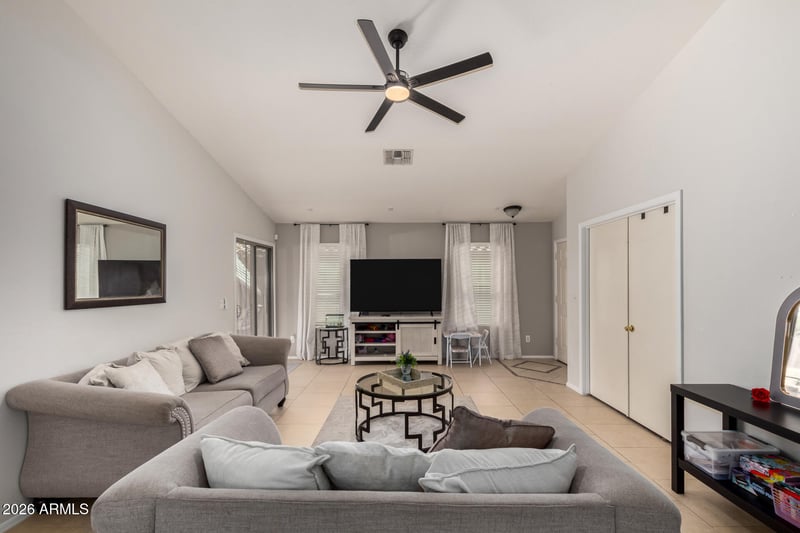 Listing details for 23749 Grove St, Buckeye, AZ 85326 : Discover this well-maintained single-level home with a 2-car garage and open great room featuring vaulted ceilings and sliding doors to the backyard patio. Interior highlights include tile flooring, ceiling fans, abundant natural light, and a neutral palette. The kitchen offers stainless steel appliances, quartz countertops, tile backsplash, pantry, and breakfast bar. The primary suite includes a walk-in closet and dual-sink bath. Backyard features a covered patio and versatile outdoor space.