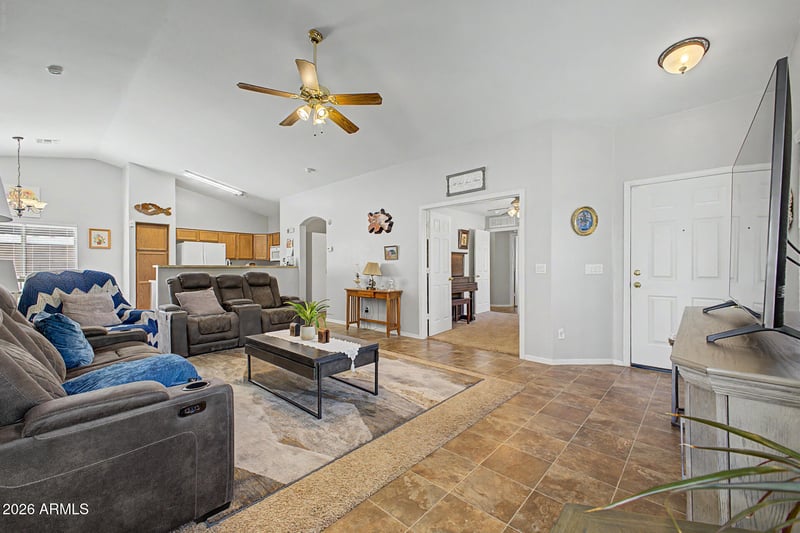 Listing details for 23975 Huntington Dr, Buckeye, AZ 85326 : This charming and cozy home has it all! Adjacent to a common area, it offers the perfect blend of privacy and comfort, with no neighbors behind or on one side. Step inside to a well-maintained and inviting interior that boasts vaulted ceilings and an abundance of natural light. The spacious living room features sliding doors that seamlessly connect to the backyard, while the eat-in kitchen is equipped with built-in appliances, wood cabinetry, a pantry, and a convenient 2-tier peninsula. Peaceful primary bedroom provides an ensuite bathroom with dual sinks and a walk-in closet. One of the bedrooms, with its double-door entry, offers flexibility as a home office. Enjoy your morning coffee under the covered patio in this lovely backyard, where unforgettable moments await! Make it yours now!