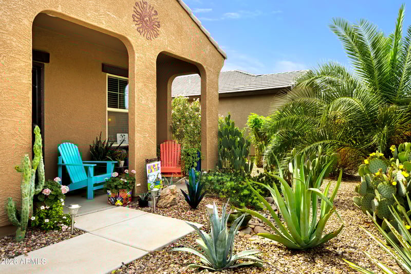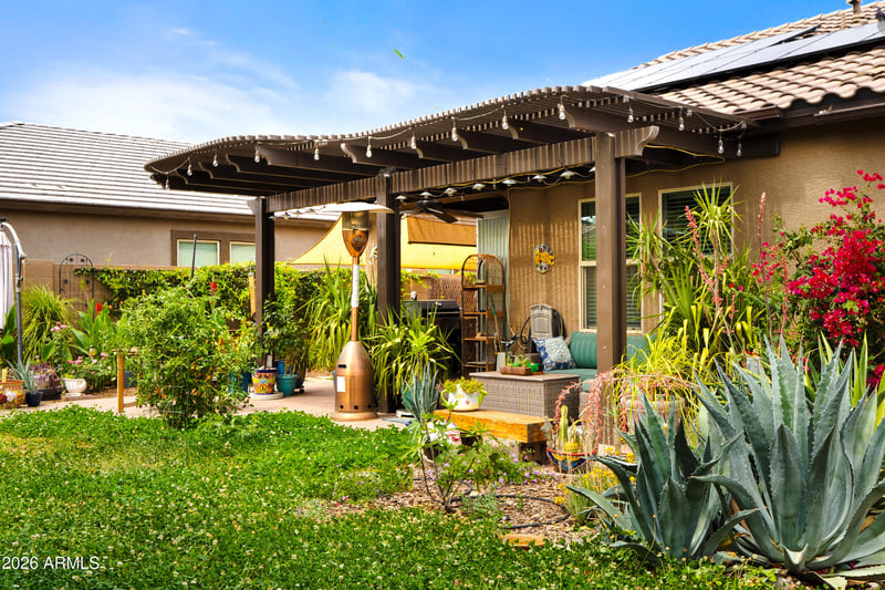 This home also includes incredible extras such as a Whirlpool WASHER AND DRYER, 2-inch faux wood blinds, and even select large furniture pieces that stay--including the COUCH, KITCHEN TABLE SET, and QUEEN-SIZED BED-making this an easy, TURNKEY opportunity. Step outside to your own private oasis with a lush green backyard filled with FRUIT AND VEGETABLE plants, including mandarin, lime, peach, pomegranate, Arizona sweet orange trees, and artichoke plants--plus a TRAMPOLINE INCLUDED for added fun! Energy efficiency is a major bonus with solar panels through Good Earth, keeping your electric bills incredibly low. The Mission Royal 2 community also offers a PRIVATE WATER AND RECREATION PARK featuring a variety of amenities for all ages, including exciting WATER SLIDES and an interactive SPLASH PAD for cooling off and family fun. The park also offers a sand volleyball court and a basketball court for active play and friendly competition. In addition, a spacious SHADED RAMADA provides a comfortable gathering space, perfect for picnics, parties, and social events.