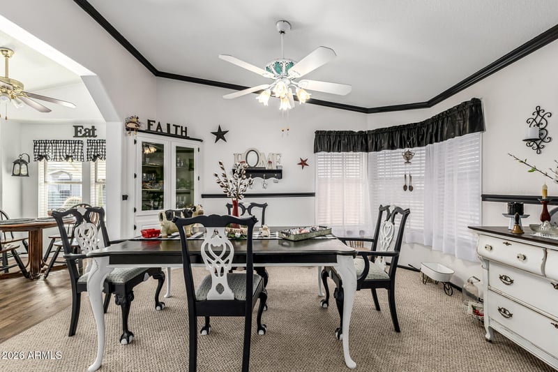 Inside, you'll find vaulted ceilings, neutral finishes, and a bright, open layout. The updated kitchen shines with shaker-style cabinetry, tile backsplash, generous counter space, and an island with breakfast bar--ideal for casual meals or entertaining. The primary suite offers a private bath, closet, and direct access to the Arizona Room, a versatile space for hobbies, relaxing, or a home office.