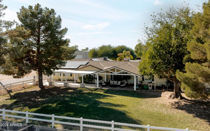 Listing details for 24050 124th St, Chandler, AZ 85249 : A rare opportunity to own a 2,400 sq ft indoor basketball court set on 1.5 acres in a Chandler County Island. This 3,900 sq ft farmhouse offers 5 bedrooms, including 2 primary suites, 3 bathrooms, a mudroom, oversized laundry, solar panels, and a 4-car garage. The open-concept kitchen is designed for gathering with a large island, granite counters, double ovens, ample storage, and a spacious dining area. An attached casita with private entrance features its own primary suite, living room, and kitchen--ideal for guests or multigenerational living. The backyard includes a pool, covered patios, built-in grill, and fire pit, while the front offers mature trees, swings, and white picket fencing.