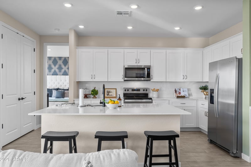 Listing details for 24057 Pueblo Ave, Buckeye, AZ 85326 : Model leaseback opportunity with built-in income from day one. This professionally designed single-story home features 4 bedrooms and 3 baths in the main residence, plus an attached private casita with its own bedroom and full bath—ideal for guests, multigenerational living, or added flexibility. The open-concept layout offers a spacious great room and upgraded kitchen with designer finishes and modern touches throughout. Thoughtfully curated model upgrades, premium materials, and low-maintenance landscaping complete the package. Own a fully upgraded model home while the builder leases it back and generates consistent rental income for you.