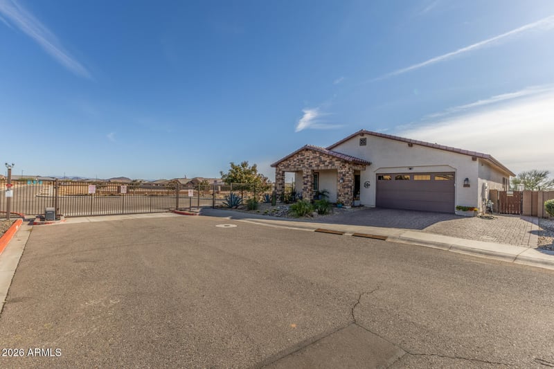 Listing details for 24145 172nd Ln, Surprise, AZ 85387 : Exceptional secluded corner lot home in the prestigious 55+ gated community of Heritage Asante! This stunning Summit model offers enhanced privacy with no rear neighbors. Be captivated by the exquisite Tuscan-inspired architecture, beautifully maintained desert landscaping, paver driveway, and porch. The sophisticated interior boasts luxury vinyl plank flooring, exposed wood ceilings, and designer finishes, including elegant wallpaper & wainscoting. The floor plan features a den and an open layout, flooded with natural light, creating a modern yet inviting atmosphere. The pristine white Gourmet kitchen showcases 42'' shaker cabinets, subway tile backsplash, floating shelves, and a generous quartzite center island. Includes a chef cooking 7 burner 48-inch gas dual stove oven. The owner's suite features an ensuite with dual vanity, a walk-in tiled shower, and custom walk-in closet