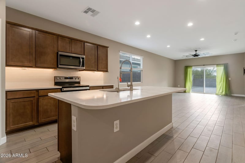 Listing details for 24153 Verlea Dr, Buckeye, AZ 85326 : This energy-efficient 4-bedroom, 2-bath home offers a bright, open layout with new 24x12 tile throughout the main living areas and dual-pane windows. The upgraded kitchen is both stylish and functional, featuring granite countertops, a tile backsplash, stainless steel appliances, a center island, pantry, and generous cabinet space, all opening to the spacious great room with direct access to the backyard.