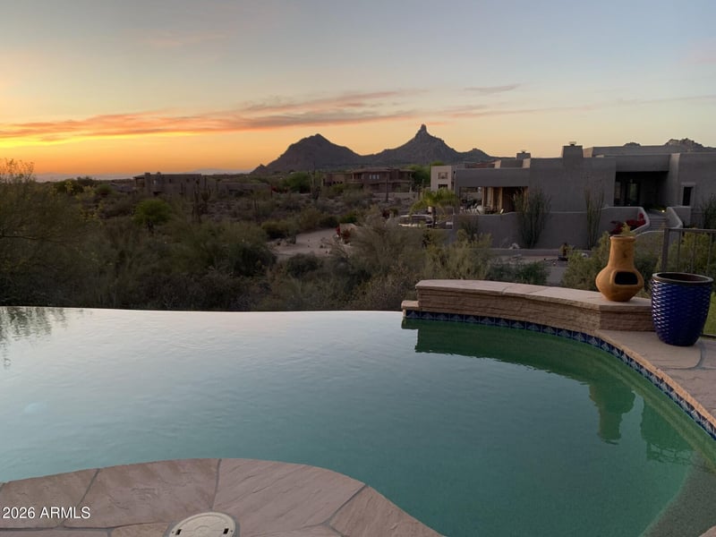 Listing details for 24200 Alma School Rd #17, Scottsdale, AZ 85255 : PREMIUM VIEW LOT in gated Sonoran Highlands offers a rare combination of privacy & sunsets. Designed for both entertaining & everyday luxury, the resort style backyard captures the essence of Troon w/a negative edge pool, BBQ, large covered patio & VIEWS. Fresh exterior paint (2025), REMODELED baths. Private courtyard w/separate entrance to guest suite. Kitchen features: REMODELED chef's kitchen w/custom cabinetry, oversized kitchen island, induction cooktop, granite counters, Miele, Bosch SubZero appliances, instant hot water. 3-car garage is a CAR LOVERS DREAM w/add'l storage, workspace, lighting and temperature controlled. An ideal winter retreat for the seasonal owner or full time resident-close to golf, hiking, biking, the Four Seasons Resort and more.. Welcome to Sonoran Highlands.
