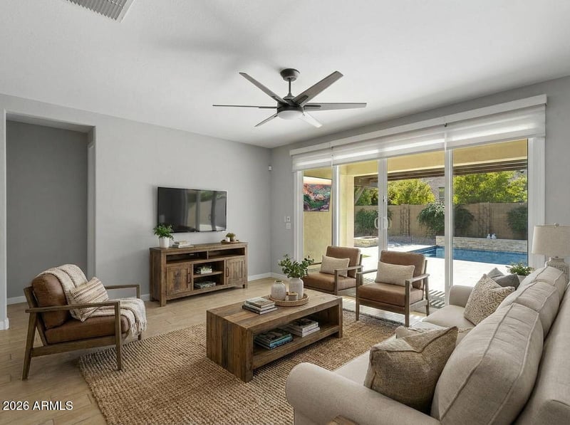 Listing details for 24214 23rd Way, Phoenix, AZ 85024 : Resort living meets effortless entertaining in this beautifully upgraded 2019 home on a premium cul-de-sac lot with N/S exposure. Designed for indoor-outdoor living, the backyard is a true retreat—perfect for hosting or unwinding—with a Pebble Tec pool, travertine decking, artificial turf, landscape lighting, built-in BBQ, fire pit, and an extended patio with dual pergolas, solar sunscreen, and mounted TV for game days, movie nights, and sunset gatherings. Inside, a stunning 12-foot Arcadia door with Hunter Douglas power blinds creates a seamless flow from the great room to the outdoors. The kitchen is built for both beauty and function with upgraded stainless steel appliances and quartz countertops, while the oversized laundry room doubles as a pantry with abundant shelving and cabinetry. The primary suite offers a spa-inspired escape with an extra-large walk-in shower, custom barn door, and a custom closet system. Guest bath has been beautifully remodeled by Jazzi Bath. This smart home delivers the perfect blend of comfort, style, and entertaining spaceanchored by a backyard that invites you to linger, laugh, and live well.