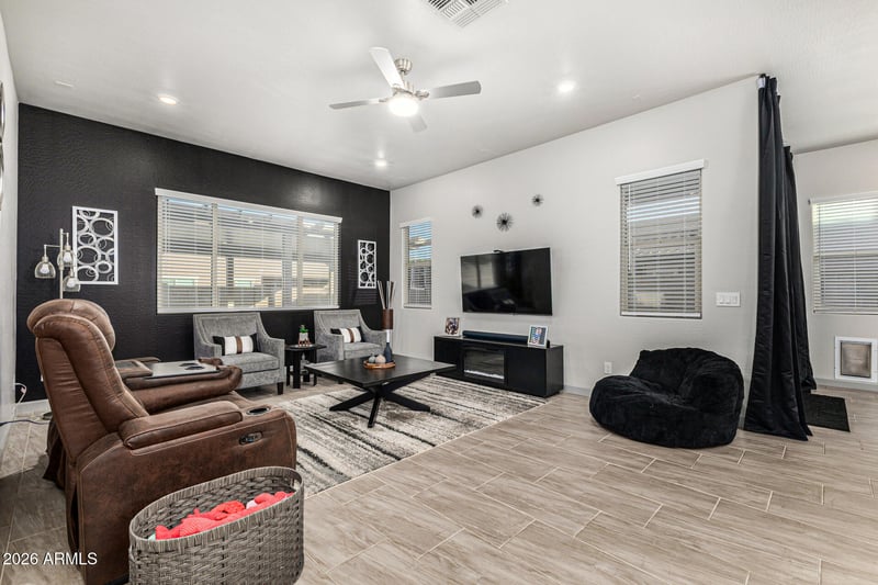 Listing details for 24253 170th Ln, Surprise, AZ 85387 : Designed for space, flexibility, and serious garage lovers, this upgraded single-level home delivers a rare 47' pull-through RV garage PLUS a 3-car tandem garage, all climate-controlled with a mini-split, insulated doors, 220V for EV/RV charging, storage cabinets, and a workbench. Inside, enjoy 3 bedrooms + a den (optional 4th bedroom), including a front ensuite with private bathroom (3 full bathrooms all with tiled showers). The open layout features 10' ceilings, 8' doors, tile floors (no carpet in main areas), neutral paint with accent walls, and an abundance of recessed LED lighting. The gourmet kitchen shines with quartz countertops, a large island with seating, gas stove, stainless appliances (fridge included), 42'' cabinets, tile backsplash with hidden outlets, and a walk-in pantry. The private primary suite overlooks the backyard and offers dual sinks, makeup vanity, oversized dual-head tile shower, water closet, linen storage, and a spacious walk-in closet. Outdoors is an entertainer's dream with low-maintenance landscaping, massive 400 sq ft gazebo, spa and built-in BBQ. For future improvements there is a gas stub & electrical sub-panel. This home has the premium Lennar package with a tankless gas water heater, zoned AC (3 thermostats), smart home features, security cameras, Ring doorbell, high-speed internet boosters and the furniture is available. Fast growing area with schools, shopping & freeway close by!