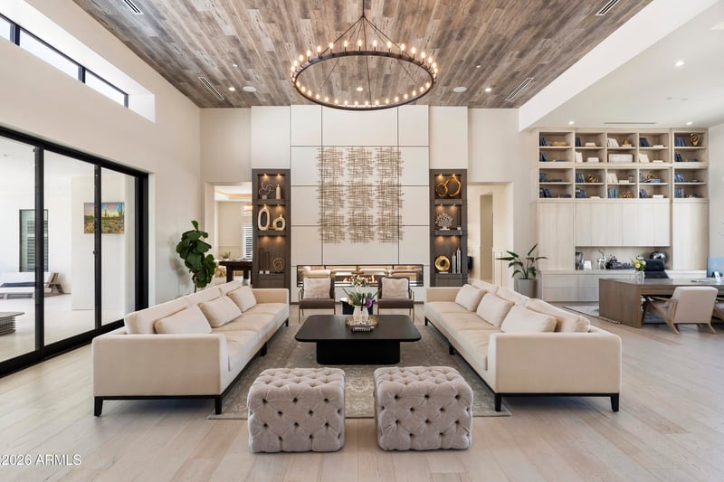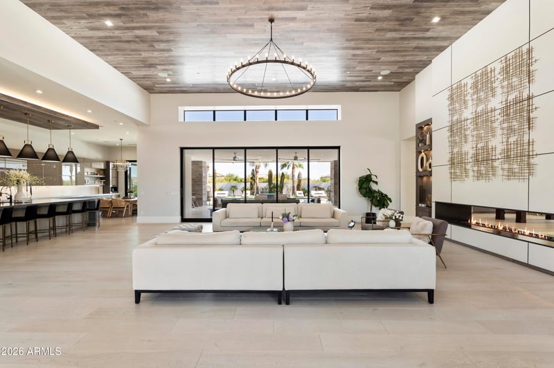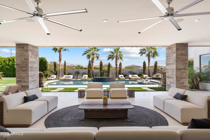 Listing details for 24351 97th Dr, Peoria, AZ 85383 : Modern contemporary estate designed for seamless indoor-outdoor living. The residence features expansive open-concept living spaces, high ceilings, and walls of glass that provide abundant natural light throughout. The great room includes custom built-ins and a sleek fireplace, creating a refined yet comfortable gathering space. The kitchen is designed for both function and entertaining, offering an oversized waterfall island, custom cabinetry, premium appliances, and statement lighting. Living and dining areas open directly to a covered patio, allowing for effortless indoor-outdoor flow. The backyard offers resort-style amenities including a pool and spa, manicured turf, modern hardscape, and multiple seating areas. A detached outdoor pavilion with full kitchen and bar provides additional space for entertaining. Architectural and landscape lighting enhance the outdoor experience day and night. Private living quarters include generously sized bedrooms and spa-inspired bathrooms with modern finishes. Thoughtfully designed for comfort, privacy, and contemporary living, this home offers an exceptional Arizona lifestyle.