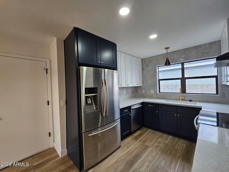 Listing details for 2437 Tamarisk Ave, Phoenix, AZ 85040 : Beautifully remodeled single-story home featuring high-end finishes and contemporary design throughout. The kitchen showcases stainless steel appliances, two-tone shaker cabinetry, quartz countertops, and a striking counter-to-ceiling tile backsplash. Vinyl wood flooring paired with upgraded carpet creates a bright, open flow across the home. The bathrooms are thoughtfully updated with premium shower systems, custom vanities, framed mirrors, and designer tile niches. Step outside to a covered patio overlooking a spacious backyard, offering endless possibilities to create your ideal outdoor retreat.