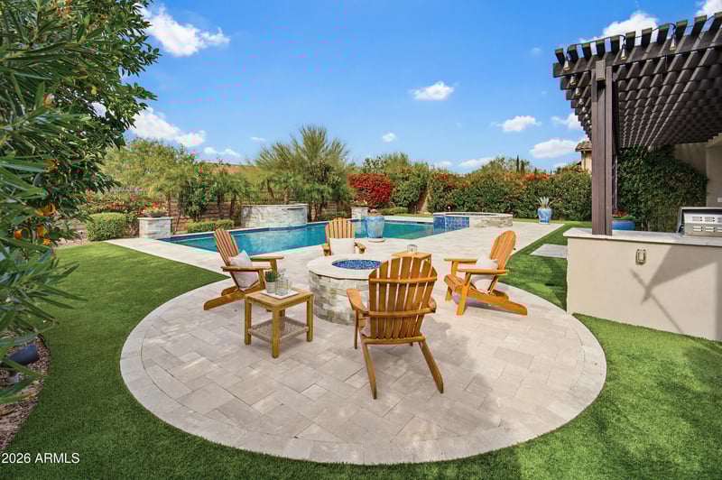 Listing details for 24404 73rd St, Scottsdale, AZ 85255 : Set behind the gates of Bocara, this exceptional Camelot residence offers refined design, extensive upgrades, and a true resort-style outdoor experience across nearly 4500 sq ft of thoughtfully designed living space. A tranquil courtyard welcomes you through a custom Cantera wrought-iron and glass front door into interiors featuring real maple hardwood flooring throughout, solid wood doors, and upgraded base, case & window trim. The expansive great room is anchored by a dramatic custom stone Isokern gas fireplace and framed by walls of glass that seamlessly connect to the backyard. The chef's kitchen is designed for both everyday living and entertaining with upgraded Thermador appliances, including a wine refrigerator, quartz countertops, extended custom cabinetry with crown molding, under-cabinet lighting, a walk-in pantry, and an additional storage. Extensive lighting upgrades, built-in surround sound, and Control4 home automation enhance comfort throughout. All bedrooms are en suite, including an expanded main-level primary suite with a sitting area, custom closet, and a spa-inspired bath with a steam-ready shower. A refined office/library features custom built-in cabinetry. The upgraded upstairs living area offers a loft, bedroom, full bath, and additional storage. A detached casita with en suite bath provides flexible guest or office space.