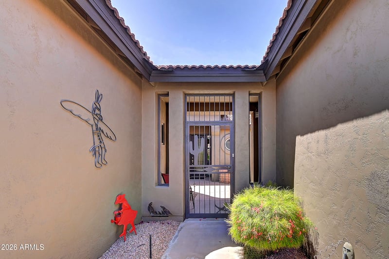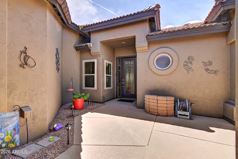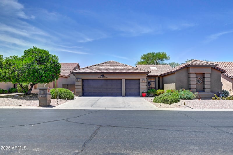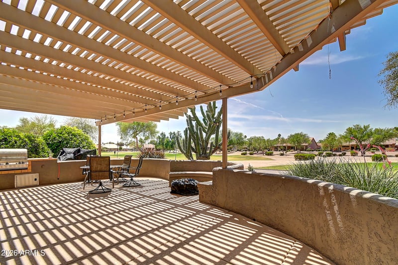 Listing details for 24526 Desert Flower Dr, Sun Lakes, AZ 85248 : Experience the perfect Arizona lifestyle in this meticulously maintained Desert Flower residence. Positioned on a premium lot facing the tee box for maximum privacy and sweeping green vistas, this home features a rare detached guest CASITA with a private bath--perfect for a home office or guest suite. Enjoy total peace of mind with a New Roof (2025), tankless water heater, water softener, and updated appliances. The resort-style backyard is built for entertaining with a built-in BBQ, firepit, and automatic sun shades. From the charming private courtyard to the independent casita climate control (mini-split), every detail has been optimized for comfort and simplicity. A true unicorn in Sun Lakes that combines structural certainty with luxury amenities.