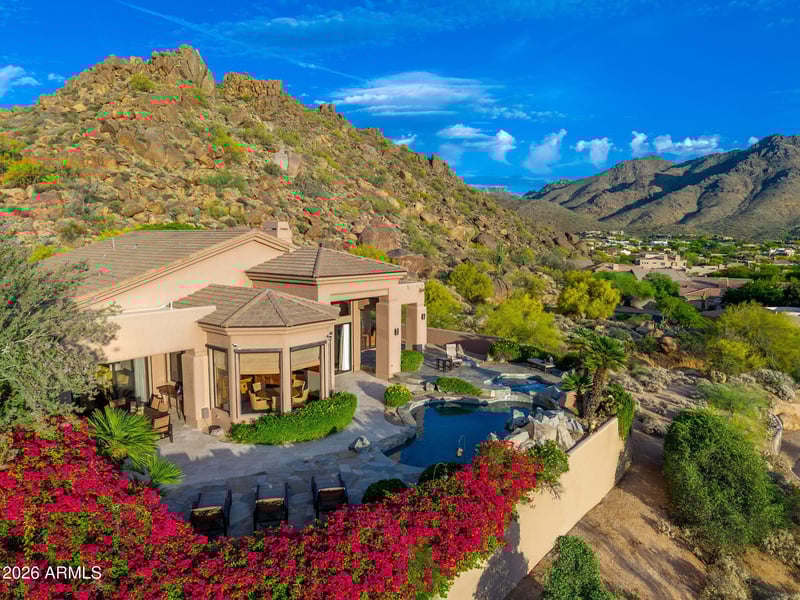 Listing details for 24598 111th Pl, Scottsdale, AZ 85255 : Perched high in the gated Quail Ridge enclave of Troon Village, this elevated residence captures unobstructed mountain, sunset, and city light views from expansive windows that bring the outdoors in. The thoughtfully designed floor plan offers approximately 3,382 square feet, featuring three bedrooms, a dedicated office, and two-and-a-half baths. It blends formal living and dining spaces with a warm, open-concept family room anchored by a striking stone fireplace. The kitchen is both functional and inviting, featuring slab granite surfaces, an island layout, a breakfast area, and a seamless connection to the family room, perfect for everyday living and entertaining. A walk-in wet bar enhances the home's entertaining appeal, while rich finishes throughout include travertine flooring, crown moldings, and custom details that elevate the overall design. The spacious primary suite serves as a private retreat, complete with a sitting area, dual walk-in closets, and a well-appointed bath. Guest bedrooms are thoughtfully positioned for privacy, and the office provides flexibility as a potential fourth bedroom. Outdoor living is where this home truly shines. Set on an elevated lot, the resort-style backyard features a heated pool and spa, a water feature, a built-in barbecue, and expansive travertine decking, all perfectly positioned to take in the breathtaking mountain landscape and city lights.