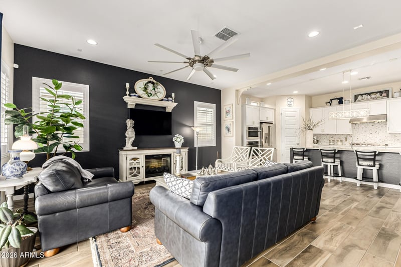 Listing details for 24697 174th Ln, Surprise, AZ 85387 : Welcome to a stand out home that feels as good as it looks--an elegant yet inviting retreat located within the gated and highly sought-after Heritage at Asante active adult community. From the moment you arrive, the home's charming curb appeal and gorgeous landscaping create a warm first impression, setting the stage for what awaits inside. Thoughtfully designed with luxury and comfort in mind, this residence offers a refined yet relaxed atmosphere that instantly feels like home. Inside, wood-look tile plank flooring flows beautifully through the main living areas, while bedrooms are accented with upgraded sculpted carpet, creating a perfect balance of style and softness. The open-concept design draws you into the heart of the home, where the kitchen truly shines. White cabinetry, quartz countertops, a gas cooktop, stainless steel appliances, pull-out drawers, custom hardware, a walk-in pantry, and a spacious island with breakfast bar make this kitchen both functional and inviting--ideal for everyday living and effortless entertaining. The kitchen opens seamlessly to the great room and dining area, filling the space with natural light and an easy, welcoming flow. A private guest suite positioned at the front of the home offers a full bath and its own covered patio, providing a comfortable and secluded space for visiting friends or family. The owner's suite serves as a peaceful retreat, featuring dual sinks, a large walk-in tiled shower, and a spacious walk-in closet with convenient direct access to the laundry room. Outdoor living is equally impressive, with two patios designed to extend your living space and invite relaxation. The backyard is a true highlight, showcasing gorgeous landscaping, widened pavers, lush greenery, and a serene setting that's perfect for enjoying quiet mornings or taking in Arizona's breathtaking sunsets. Life in Heritage at Asante is about more than just a beautiful home--it's about lifestyle. Residents enjoy resort-style amenities including a clubhouse, sparkling pool and spa, fitness center, pickleball courts, putting course, and scenic walking trails, all within a vibrant and welcoming 55+ community. With convenient access to nearby shopping, dining, and recreation, everything you need is close at hand. Whether you're searching for a full-time residence or the perfect seasonal retreat, this exceptional home offers comfort, connection, and timeless appeal. From the moment you step inside, you'll feel the harmony of thoughtful design and relaxed luxury. Welcome to the next chapter--you're going to love it here.