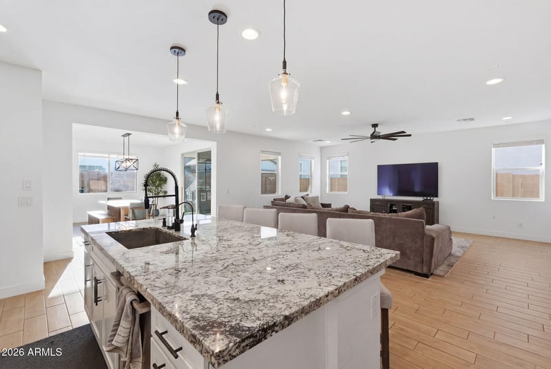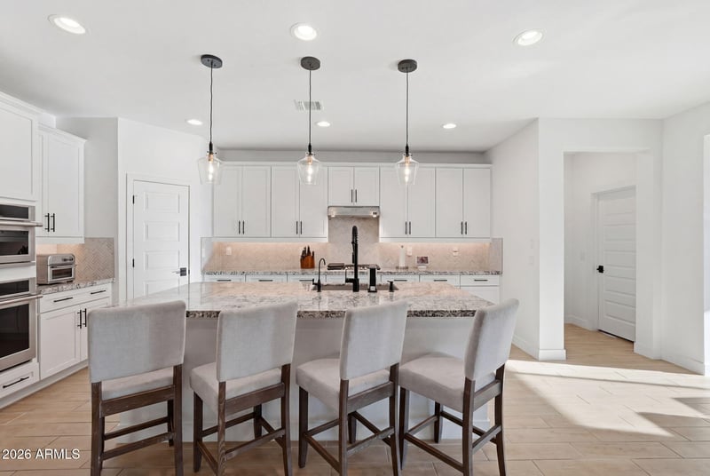 Listing details for 24884 143rd Dr, Surprise, AZ 85387 : Built just a few years ago, this Surprise home offers the benefits of newer construction with thoughtful upgrades already in place. Inside, the gourmet kitchen package includes granite countertops, under cabinet LED lighting, pendant lights, stainless appliances, a gas line for a future outdoor kitchen, and details like pots and pan drawers and built in trash and recycling. Recessed lighting runs throughout the home, and speaker prewire is already in place in the office, living room, and primary bedroom. One of the two primary suites features a super walk in shower and a layout that feels open without wasting space. Matte black Moen fixtures, ceiling fans, tankless water heater, reverse osmosis system, a water softener, updated lighting, and laundry room plumbing for a sink add a clean, consistent look throughout the home The backyard has been finished with turf and rock, completed in December 2024, creating a low maintenance outdoor space that is ready to use. Located near parks, shopping at The Village at Prasada, Lake Pleasant, top notch golf courses, and easy access to the 303 and 17, this home is a must see!