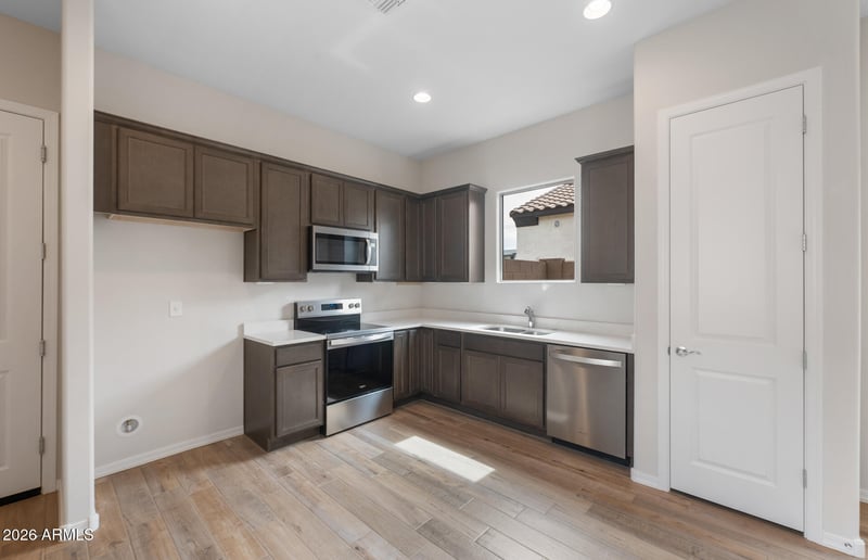 This Coventry floor plan offers an elevated living experience with 4 bedrooms, 3 baths, a no-step walk-in shower in the owner's suite, 10' ceilings, and 8' interior doors. Designed for comfort and versatility, the home includes a secondary kitchen and living area ideal for multi-generational living. The main kitchen features built-in appliances, a gas cooktop, and quartz countertops, with matching quartz surfaces in the secondary kitchen for a cohesive and refined finish.