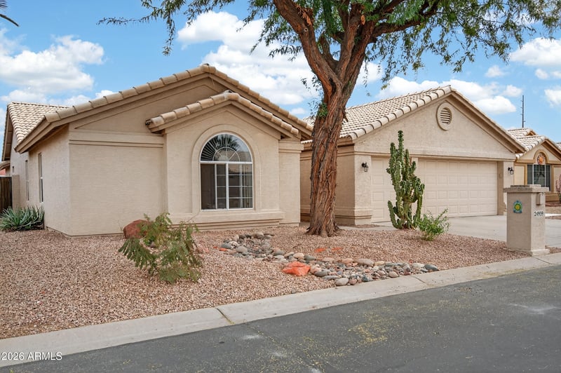 Listing details for 24939 Lakewood Dr, Sun Lakes, AZ 85248 : Welcome to your dream home in the prestigious guard gated community of Sun Lakes! This stunning 3 bed plus den, 2 bath retreat offers the perfect blend of comfort and style. Two spacious living areas provide plenty of room for entertaining, while the chef's kitchen boasts Corian countertops, gas stove, stainless appliances, tiled backsplash, and a Samsung touchscreen fridge. Enjoy morning coffee in the breakfast nook, then step through the sliding door from your primary suite to your private oasis—a covered patio with built-in BBQ, pavered entertaining space, and mature landscaping featuring an orange jubilee and majestic ficus tree. Practical luxury abounds with a large laundry room complete with washer & dryer, plus a 2 car garage with BONUS golf cart bay. Recent upgrades include 2024 water softener/RO filtration system, 2025 attic insulation, and 2024 hot water heater with booster for the master bath. Sun Lakes offers an unparalleled active adult lifestyle with world-class amenities including championship golf courses, resort-style pools, state-of-the-art fitness centers, tennis and pickleball courts, restaurants, and endless social clubs and activities. Experience the ultimate in 55+ living!