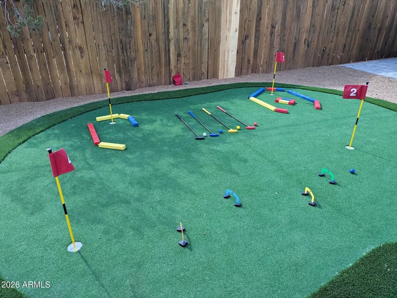 Double backyards deliver endless fun: upper level with hot tub, giant chess, dining lounge, gas grill, and stunning red rock views from the deck. Lower yard features private bocce court, putting green (custom mini-golf walls, adjustable clubs), fire pit, covered cabanas, lighted cornhole.