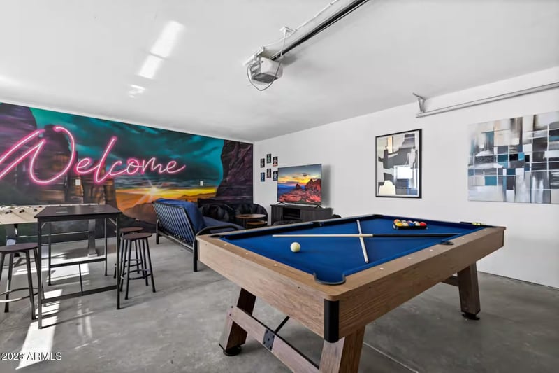 Converted garage game room: pool table, foosball, shuffleboard, 65'' TV for movies/gaming. Smart lock entry w/ 4 yrs of rental history.