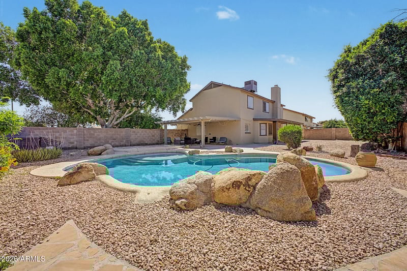 Listing details for 2504 Kristen St, Mesa, AZ 85213 : Back on market after freshly painted exterior! On a HUGE lot shaded by mature trees, this beautiful 4-bedroom, 3-bathroom Mesa home offers the perfect blend of space, comfort, and backyard living. Inside, the spacious layout features multiple living areas and elegant plantation-style shutters that add charm while letting in natural light. Whether hosting gatherings or enjoying a quiet night in, the design makes everyday living easy. Step outside to your private retreat with a sparkling pool, lush greenery, and rare mature trees. With plenty of room to entertain, relax, or garden, this backyard offers endless possibilities. Homes with space, character, and a pool are hard to find, come see it for yourself!