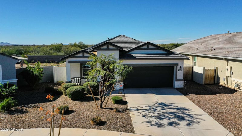 Listing details for 25088 186th Ln, Wittmann, AZ 85361 : Imagine living in a quiet neighborhood known for its gorgeous sunsets and drifting hot air balloons. If that sounds like you, welcome to this beautifully upgraded home, lived in for less than three years. The 3 bedroom 2 bathroom Hummingbird model has an open concept floor plan featuring 9-foot ceilings giving a bright airy atmosphere. The impeccable kitchen displays ample cabinetry, granite countertops, stainless steel appliances, and an island with a breakfast bar. Enjoy the convenience of a landscaped backyard offering a serene outdoor retreat with no neighbors behind you. Smart Home Technology included. Enjoy multiple parks, walking paths and playgrounds.
