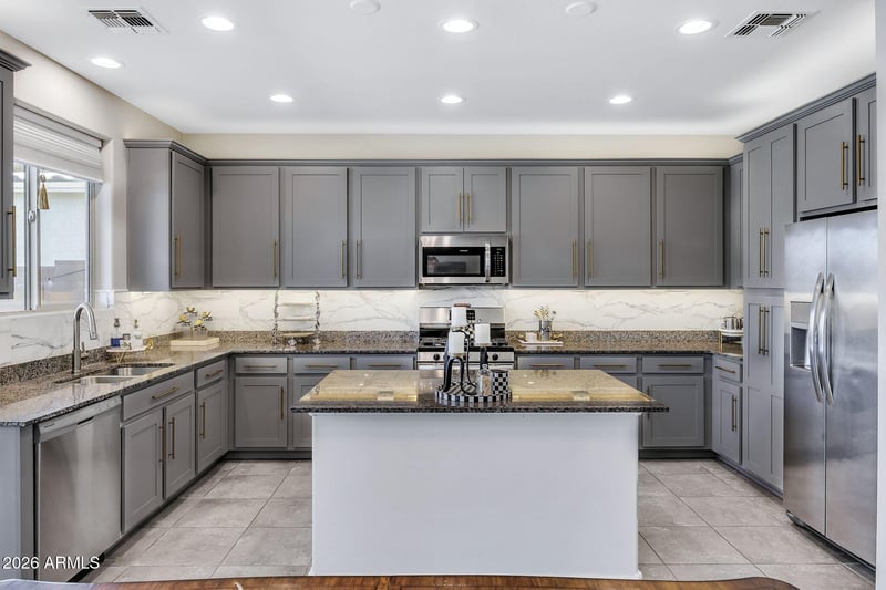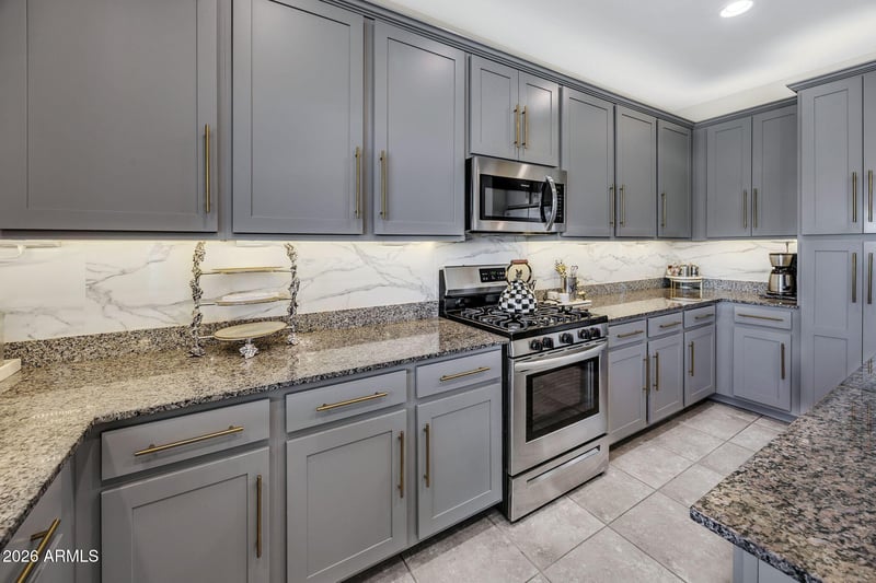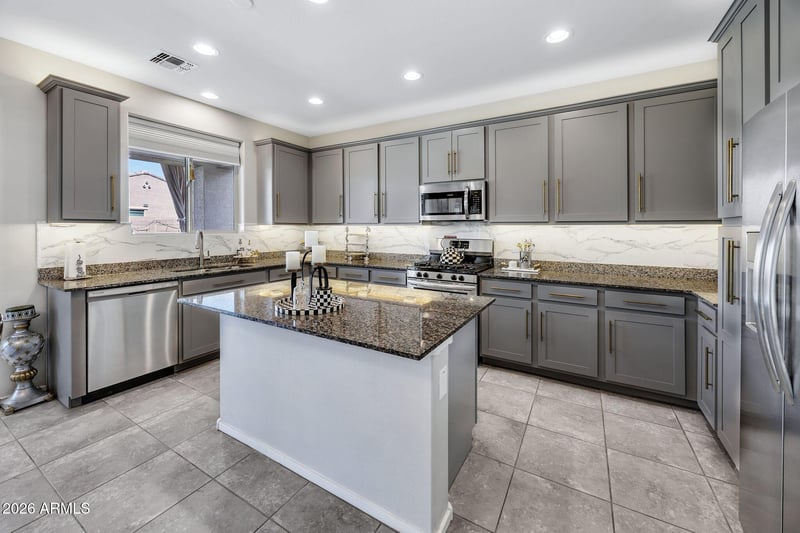 Listing details for 25218 143rd Ln, Surprise, AZ 85387 : Welcome to Rancho Mercado! This stunning 5 bed, 3 full bath home offers the perfect blend of space, style, and functionality. Featuring a full bedroom and bathroom downstairs--ideal for guests or multigenerational living. The gourmet custom kitchen shines with granite countertops, quartz backsplash, and soft-close cabinetry. All appliances included, plus a water softener for added convenience. Enjoy the open, spacious floor plan and step outside to your private backyard oasis with a large shaded patio, sparkling pool, and lush landscaping.Enjoy mature citrus trees and lots of shade around the pool. Fence gates on both sides add flexibility and access. This one checks all the boxes!