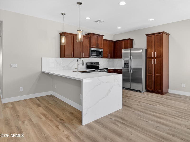Listing details for 25220 Maldonado Dr, Buckeye, AZ 85326 : Beautifully updated 3-bedroom, 2-bath home featuring a modern kitchen with a stunning waterfall countertop and sleek finishes. Luxury vinyl plank flooring runs throughout the home, with tile in the bathrooms and laundry room. All new kitchen appliances are included, making this home truly move-in ready. Additional features include a 2-car garage, RV gate, EV charger, and a convenient laundry room. Large backyard ready for you to make it your own.