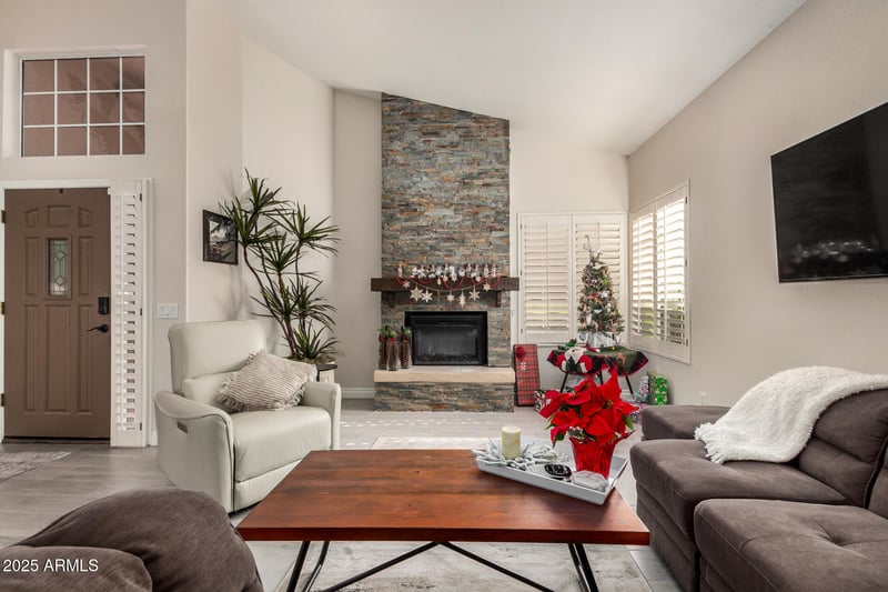 Listing details for 25236 Flame Tree Dr, Sun Lakes, AZ 85248 : Beautifully maintained 2-bedroom home with a 3-car garage radiates style and comfort at every turn! Perfect for everyday living and entertaining, this light-filled home features an airy living and dining area anchored by a stunning floor-to-ceiling stone fireplace, plus a spacious great room bathed in natural light. Wood-look tile flooring, soaring vaulted ceilings, neutral tones, and plantation shutters are features you'll love. Recent upgrades include all-new interior paint, a new refrigerator, new garage doors, new garage door openers, and a roof replaced just two years ago. The spotless kitchen showcases ample cabinetry with crown molding, stainless steel appliances, a tile backsplash, granite countertops, and recessed lighting that brightens every corner. The serene primary retreat impresses with private outdoor access, a walk-in closet, and a fully remodeled ensuite bathroom featuring a makeup desk. Step outside to enjoy amazing golf course views from your oversized golf lot, complete with a huge covered back patio, side yard, exterior fireplace, gazebo, and built-in BBQideal for relaxing or entertaining while taking in the scenery. Hurrythis one won't last!