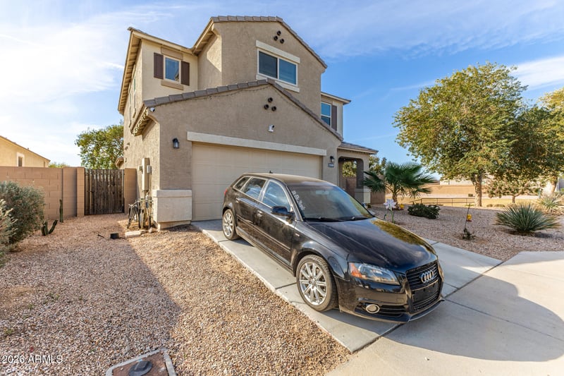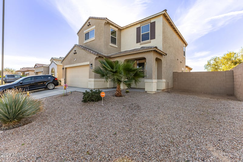 Listing details for 25409 Darrel Dr, Buckeye, AZ 85326 : Welcome to this stunning 5-bedroom, 3.5-bath home on a corner lot in the desirable Blue Hills subdivision, next to a serene greenbelt and backing a private park—offering unmatched privacy and open space. The north/south-facing lot features a spacious backyard, covered patio, front porch, and low-maintenance desert landscaping. Step inside to a bright, open floor plan. The primary suite on the main level boasts a huge walk-in closet, and there's a convenient half bath downstairs. The kitchen opens to the great room and showcases espresso cabinetry, granite countertops, built-in microwave, coffee bar, and breakfast bar. There's also a separate breakfast/dining area, perfect for enjoying meals. Upstairs, a huge loft provides flexible space for entertaining, a playroom, or home office.