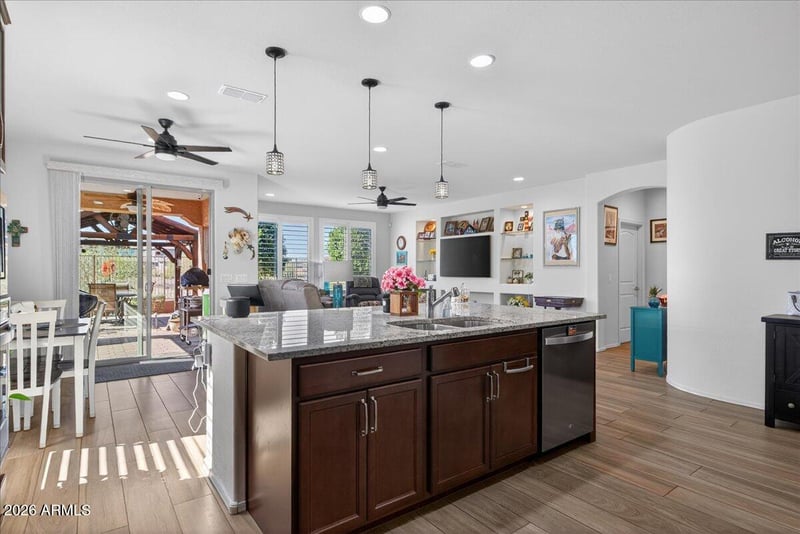 Listing details for 25466 163rd Dr, Surprise, AZ 85387 : Upgraded, move-in ready home with a chef's kitchen, and a flexible den in Surprise. This beautifully maintained 3-year-old home offers 2 bedrooms plus a den and 2 bathrooms with an open floorplan, granite countertops and whole home water filtration system. The chef's kitchen features a large center island, upgraded finishes, and custom light fixtures, complemented by porcelain tile flooring throughout and plantation shutters. The backyard is thoughtfully landscaped with synthetic grass, patio pavers, a gazebo, and mature trees, creating a private outdoor retreat. Additional highlights include an electric vehicle charger and an insulated 3-car tandem garage with a mini-split system, ideal for climate-controlled storage, a workshop, or home gym. Move-in ready with modern upgrades throughou